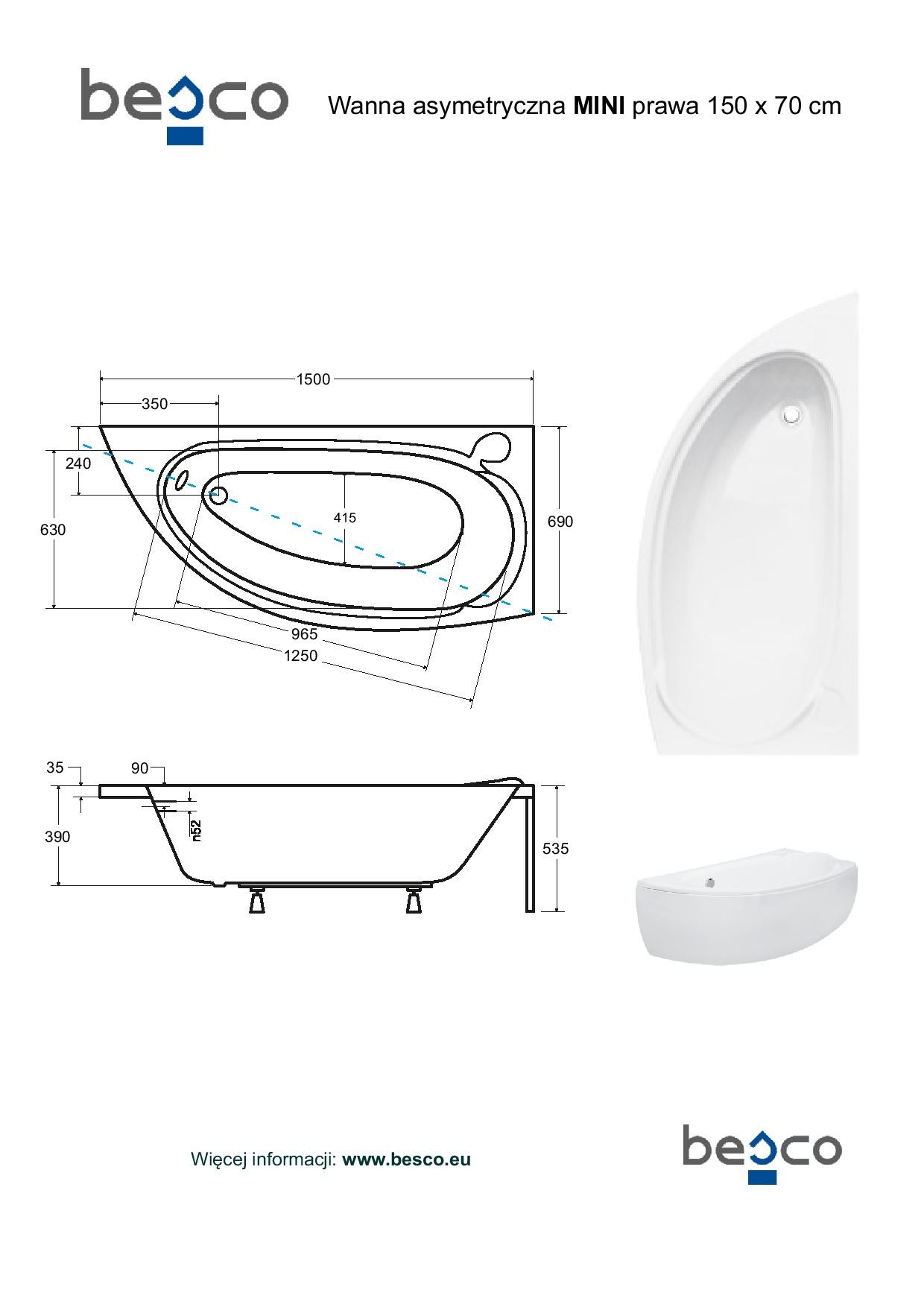 Asymetrická vana MINI 150 (1500x700 mm), pravé provedení, bez nožiček