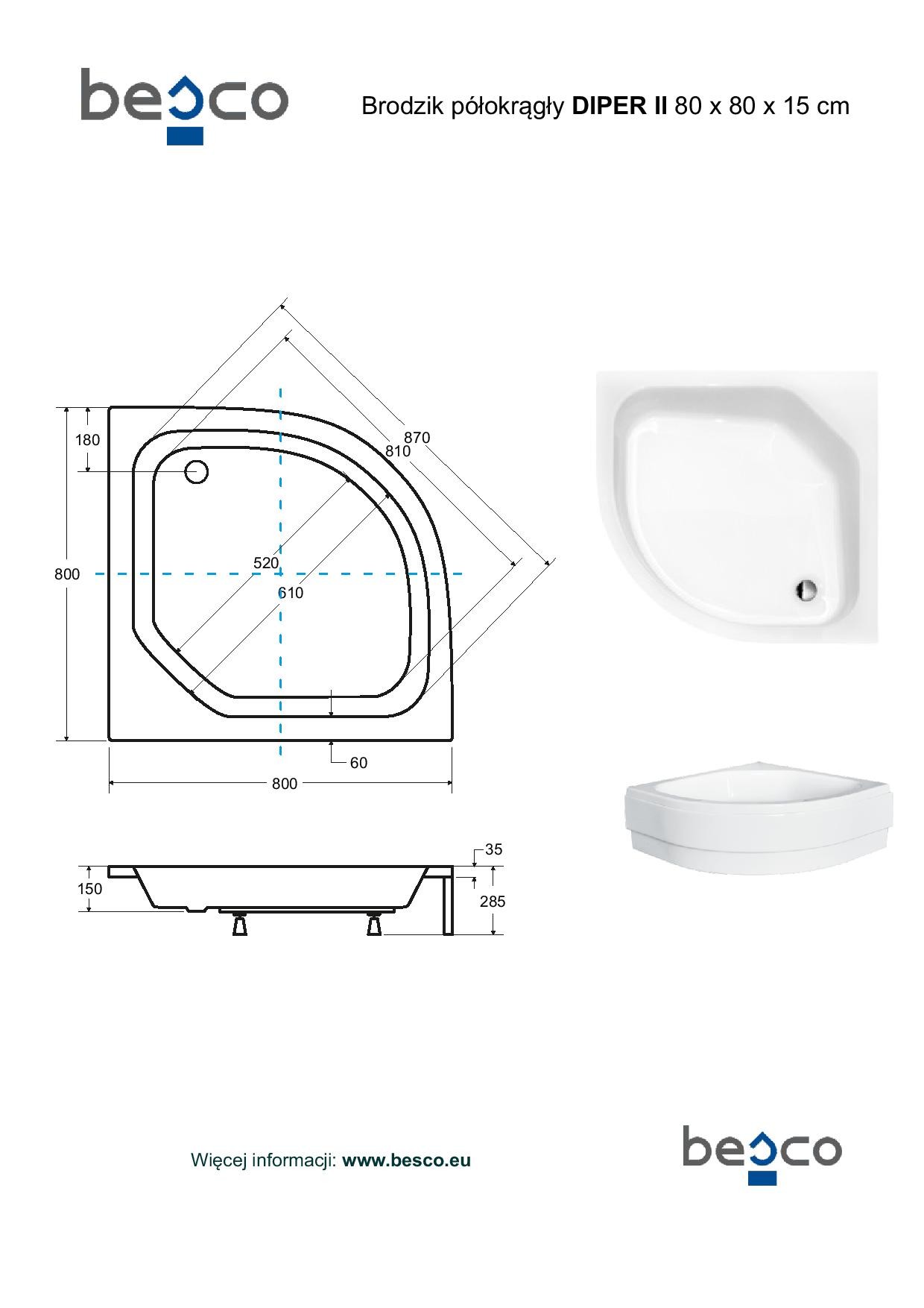 Sprchová vanička DIPER II je určena ke čtvrtkruhovým zástěnám 80x80 a 90x90 cm a s rádiusem R550, Sprchovou vaničku je možné osadit s akrylátovým čelním panelem, nebo je ji možné obezdít.