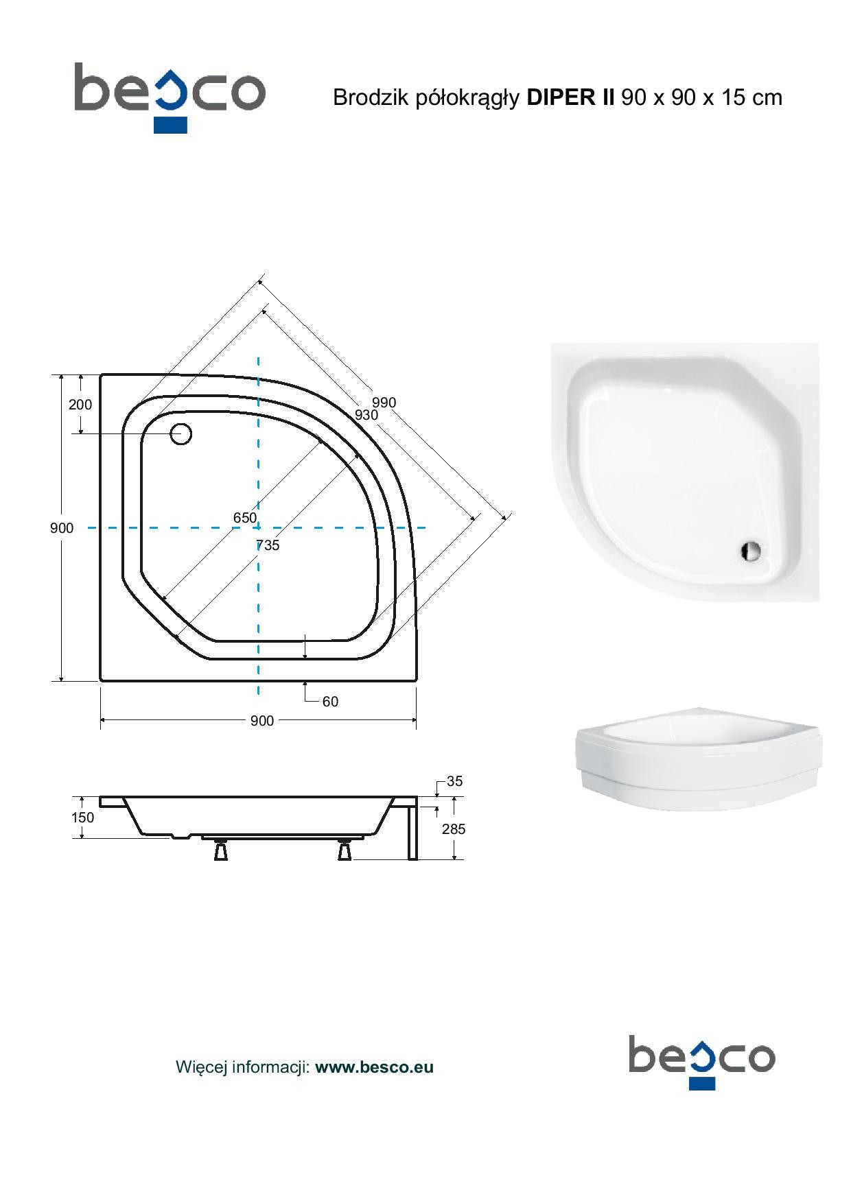 Sprchová vanička DIPER II je určena ke čtvrtkruhovým zástěnám 80x80 a 90x90 cm a s rádiusem R550, Sprchovou vaničku je možné osadit s akrylátovým čelním panelem, nebo je ji možné obezdít.