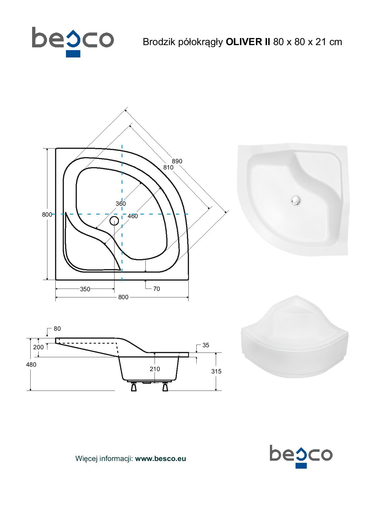 Sprchová vanička OLIVER II je určena ke čtvrtkruhovým zástěnám 80x80 a 90x90 cm a s rádiusem R550, Sprchovou vaničku je možné osadit s akrylátovým čelním panelem, nebo je ji možné obezdít.