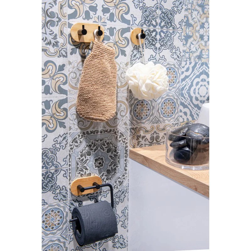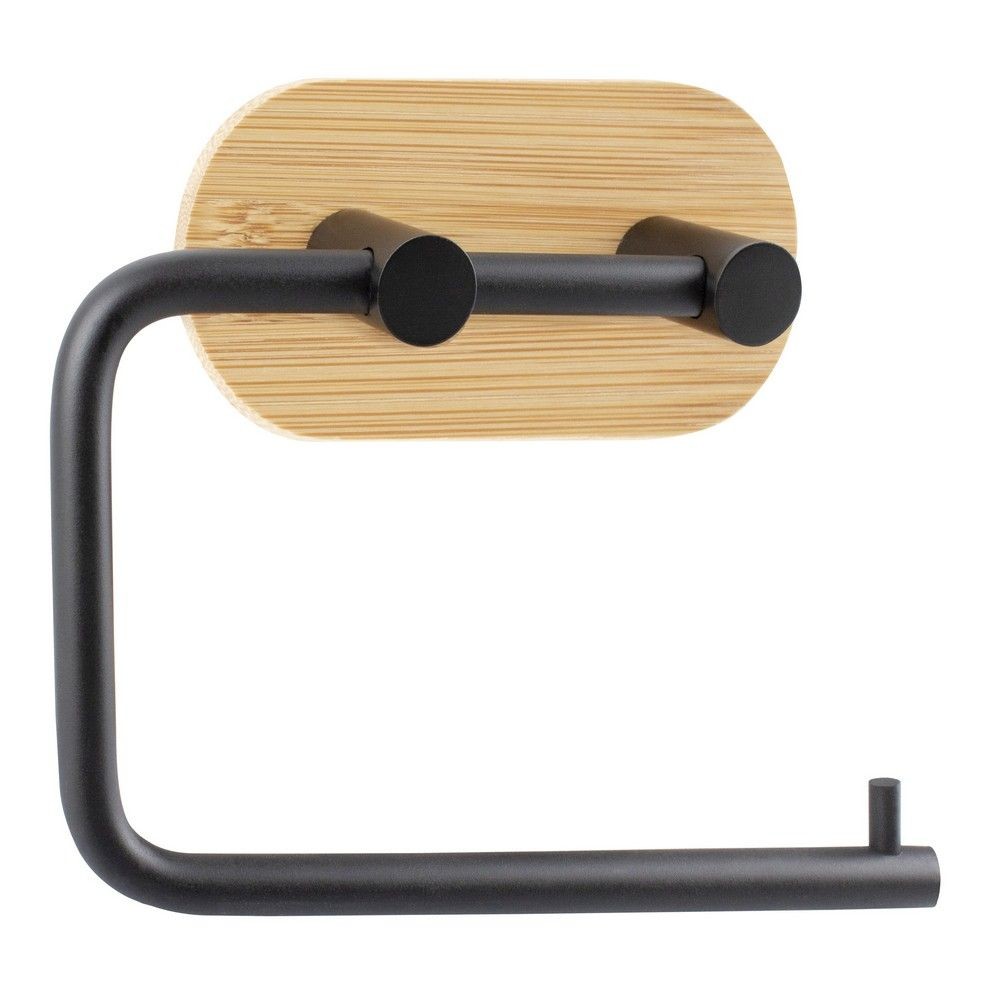 Držák toaletního papíru z kvalitní, černě lakované, oceli v kombinaci s populárním bambusem. Největší výhodou tohoto věšáku je jednoduché lepení na obklady pomocí velice silné 3M pásky. Samolepící koupelnové doplňky jsou ideálním řešením, pokud nechcete vrtat do obkladů. Velmi kvalitní lepící páska 3M přilne k různým povrchům a umožňuje snadné odstranění doplňků bez zanechání stop či poškození. Jeho maximální nosnost je 1 kg.