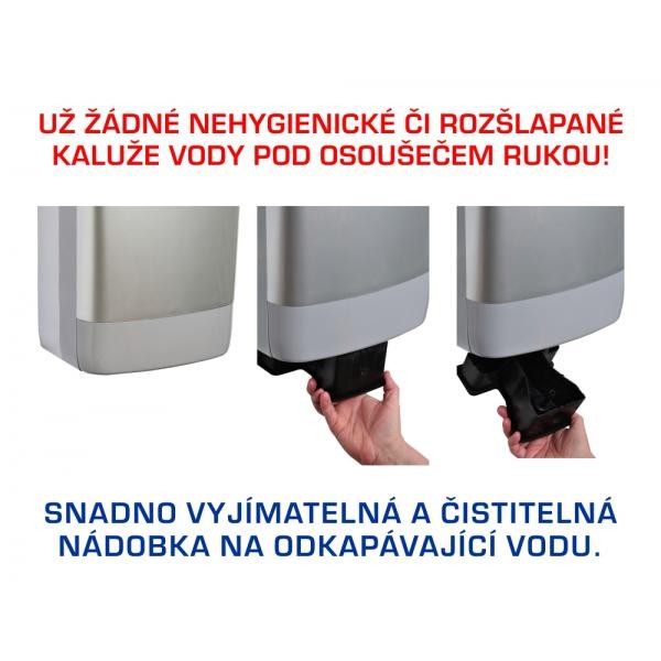 - Odnímatelný zásobník na vodu pro suchou podlahu pod osoušečem (POZOR na osoušeče, které nemají odkapávací misku – voda stékající na podlahu představuje nepořádek a zhoršenou hygienu)
