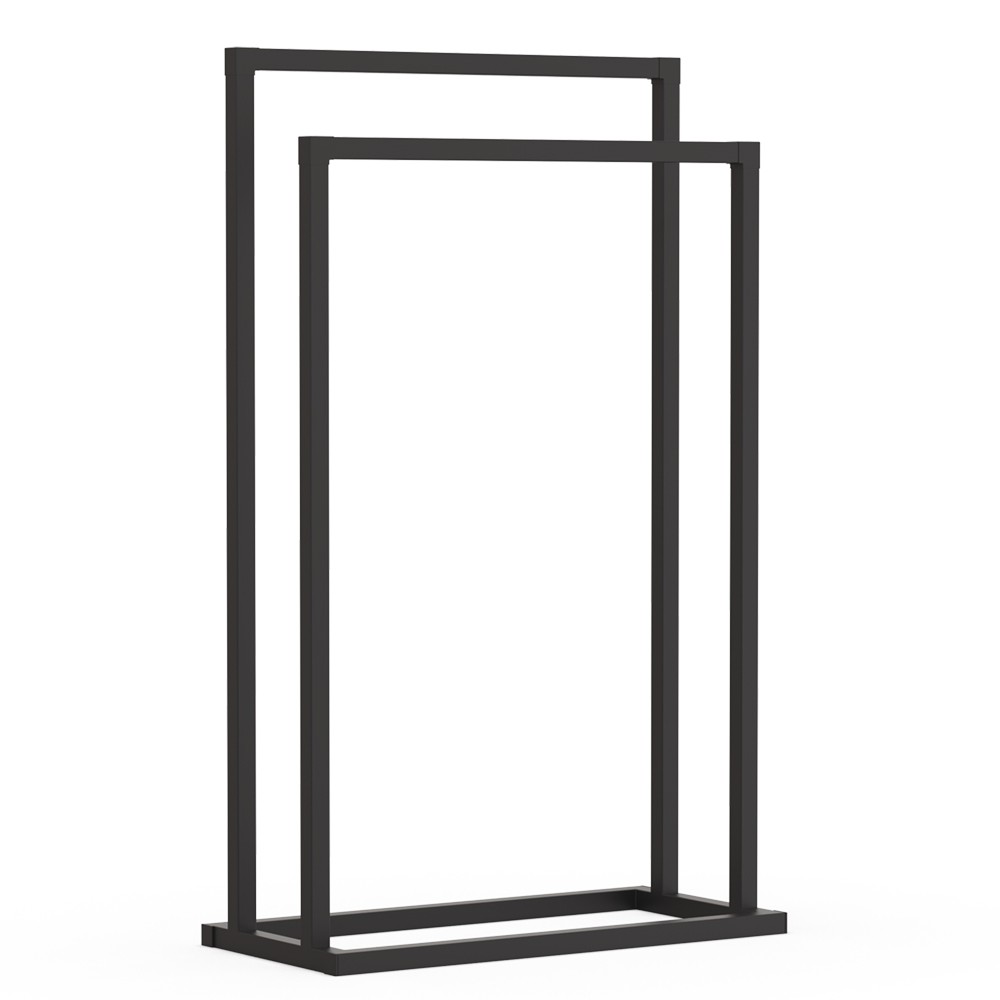 Moderní stojací věšák na ručníky se dvěma rameny navržený v jednoduché geometrické formě. Je vyroben z kvalitní oceli lakované černě s matným povrchem. Věšák na ručníky má stabilní základnu zajištěnou plastovými nožičkami. Výrobek vyžaduje vlastní montáž.