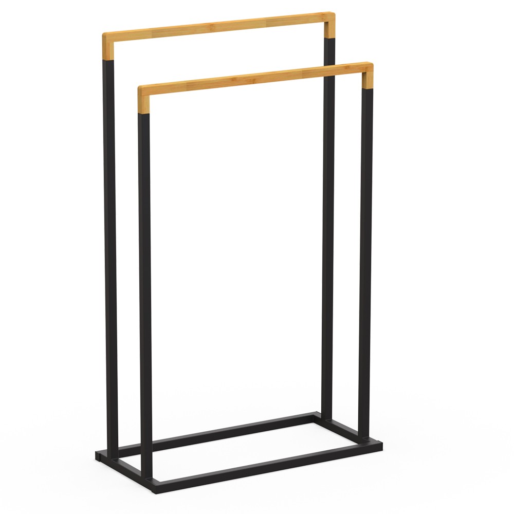 Moderní stojací věšák na ručníky se dvěma rameny navržený v jednoduché geometrické formě. Byla vyrobena z oceli lakované černě s matným povrchem a na výrobu horních ramen bylo použito přírodní bambusové dřevo. Věšák na ručníky má stabilní základnu zajištěnou plastovými nožičkami. Výrobek vyžaduje vlastní montáž.