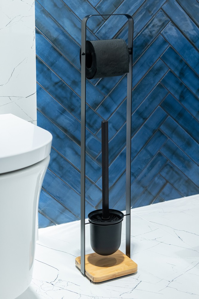 Moderní koupelnový stojan na toaletní papír se závěsnou wc štětkou. Je vyroben z kvalitní oceli lakované černě s matným povrchem. Základna stojanu je vyrobena z přírodního bambusu a má dodatečné zatížení, díky čemuž je masivní a stojan je velmi stabilní. Na jeho spodku jsou navíc namontovány 4 silikonové nožičky, které ochrání jak samotný stojan před oděrem, tak podlahu před poškrábáním. Zásobník wc štětky je vyroben z černého plastu a je umístěn na okraji uvnitř stojanu. Dá se snadno vyjmout, aby se vyprázdnila a vyčistila.
