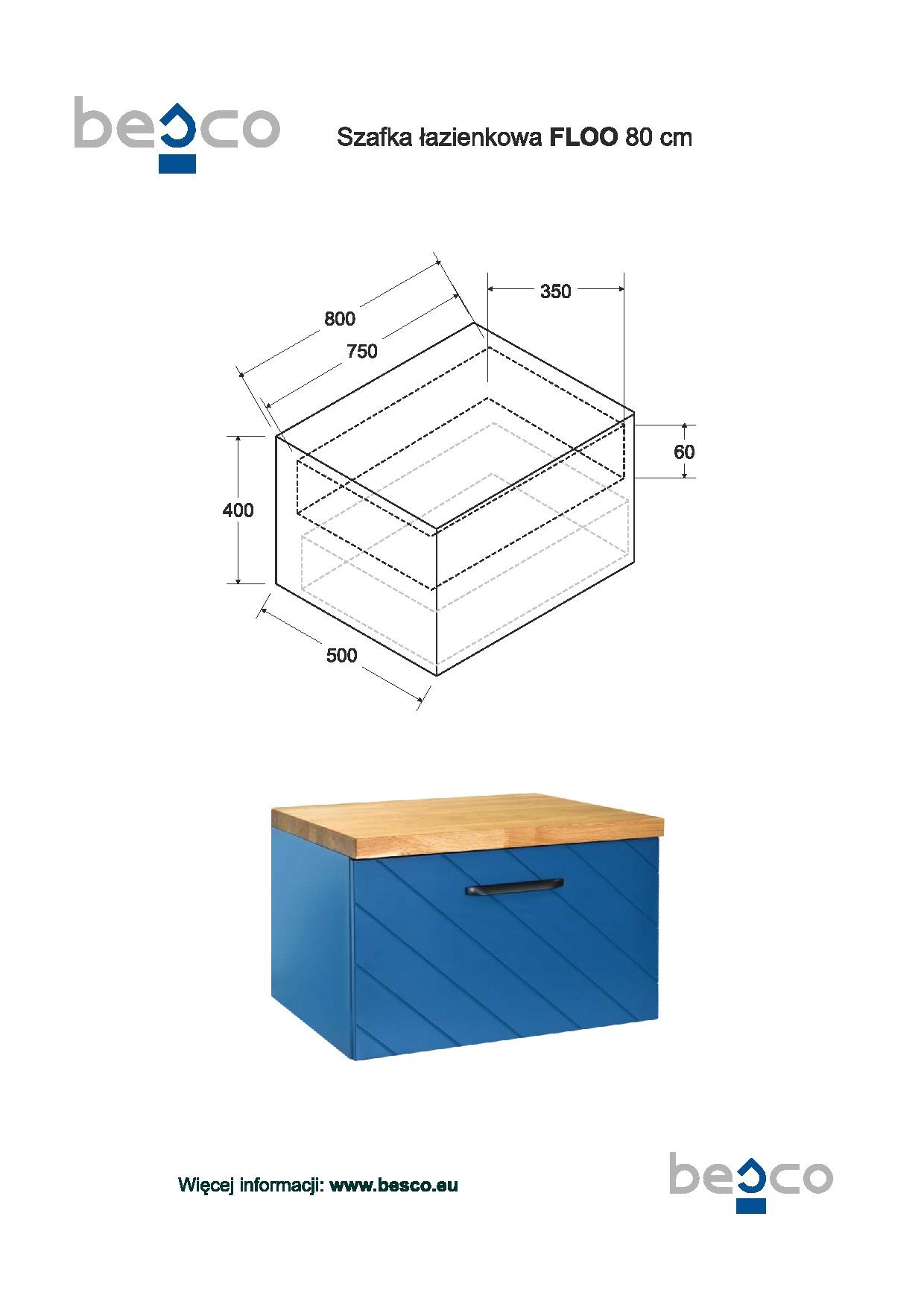 Populární elegantní design, široká barevná škála (čtyři barevné varianty - bílá matná, modrá matná, zelená matná a černá matná), kvalitní zpracování a moderní frézování na čele šuplíku, to je naše nová série FLOO. Součástí dvířek je i značkový tlumič dorazů pro tzv. tiché dovírání (soft-close). Nábytek dodáváme ve smontovaném stavu. Ke spodní skříňce si musíte doobjednat horní desku pod umyvadlo, kterou lze objednat ve třech barevných variantách (černá, mramor a dub).