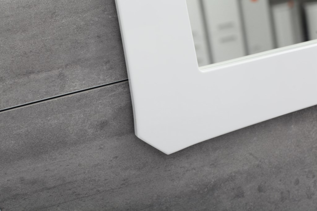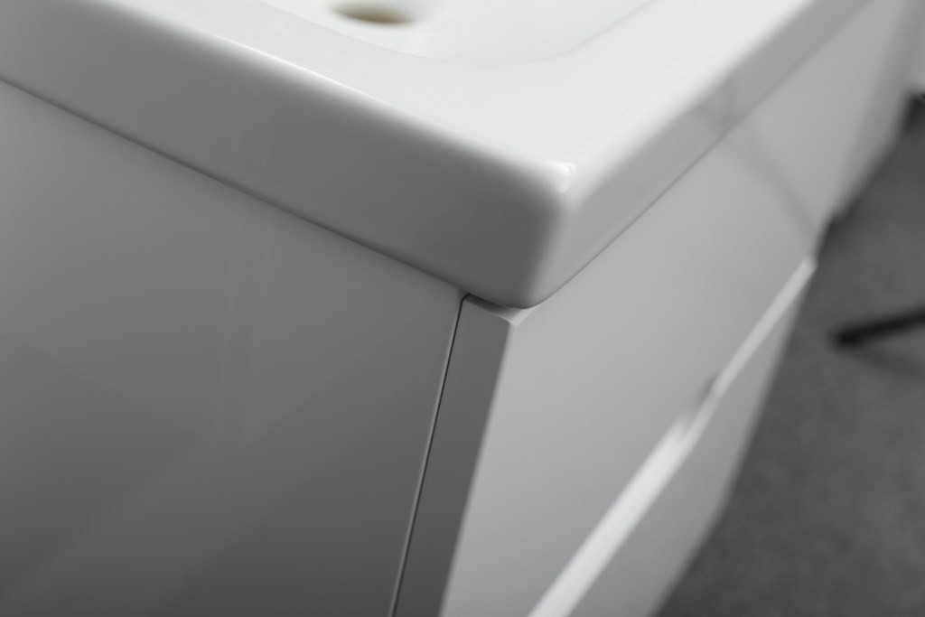 Díky „tichému zavírání“ se dvířka a zásuvky v poslední fázi zavírání zpomalí a zavřou se téměř tiše. Zakřivená linie čel s elegantní frézou dává lehký a jemný styl. Celek dotváří obdélníkové moderní keramické umyvadlo.