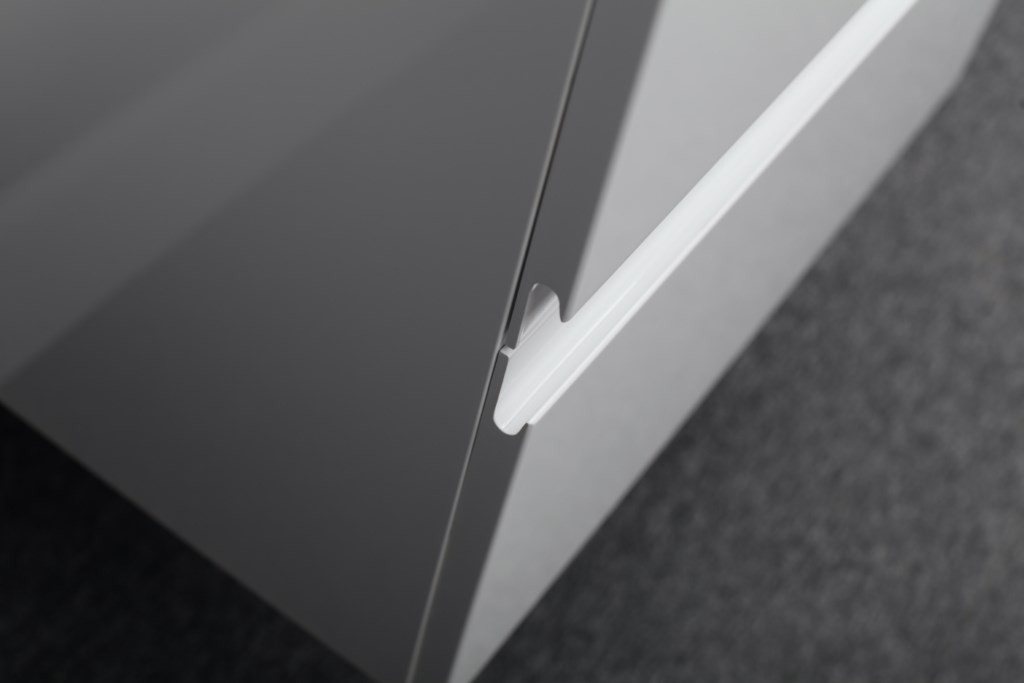 Skříňka série Venecia je vybavena značkovými komponenty REJS - zásuvka s tlumením a dotahem, kování REJS.