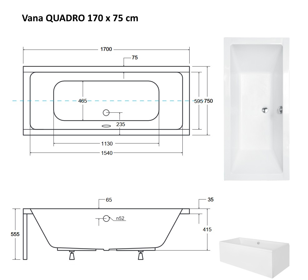 vana QUADRO 170 (1700x750 mm), bez nožiček