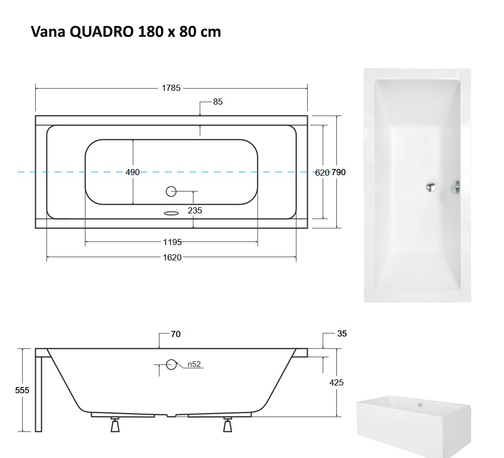 vana QUADRO 180 (1785x790 mm), bez nožiček