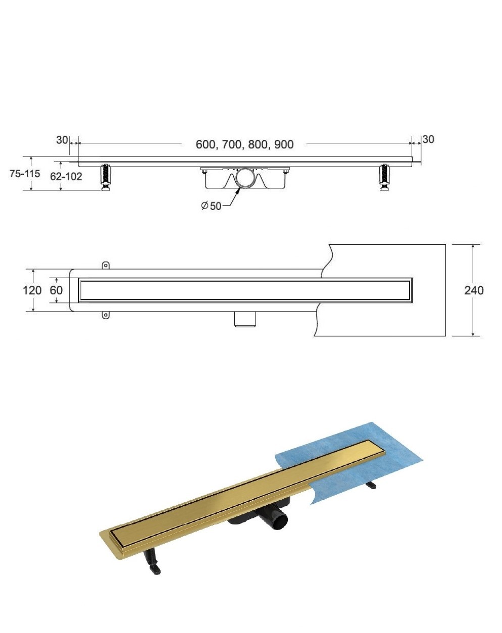 Kvalitně a moderně zpracovaný odtokový žlab. Tělo žlabu i vlastní rošt je vyroben z velice kvalitní nerezi a jsou oba s povrchovou úpravou ve zlaté broušené barvě. Rošt lze použít buď pro vložení dlažby, nebo jako pohledový (zlatá broušená barva). Tento žlab obohatí každou koupelnu o nádech luxusu. Sada obsahuje: žlab se sifonem a nožičkami, rošt a hydroizolační pásku.