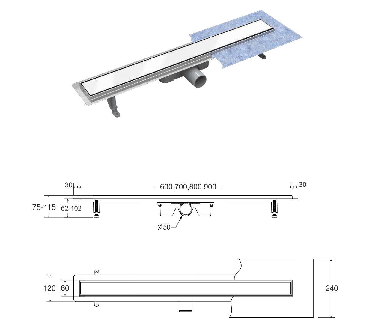 Kvalitně a moderně zpracovaný odtokový žlab, vyroben kombinací nerezu a roštu s bílým sklem obohatí každou koupelnu o nádech luxusu. Sada obsahuje: žlab se sifonem a nožičkami, rošt a hydroizolační pásku.