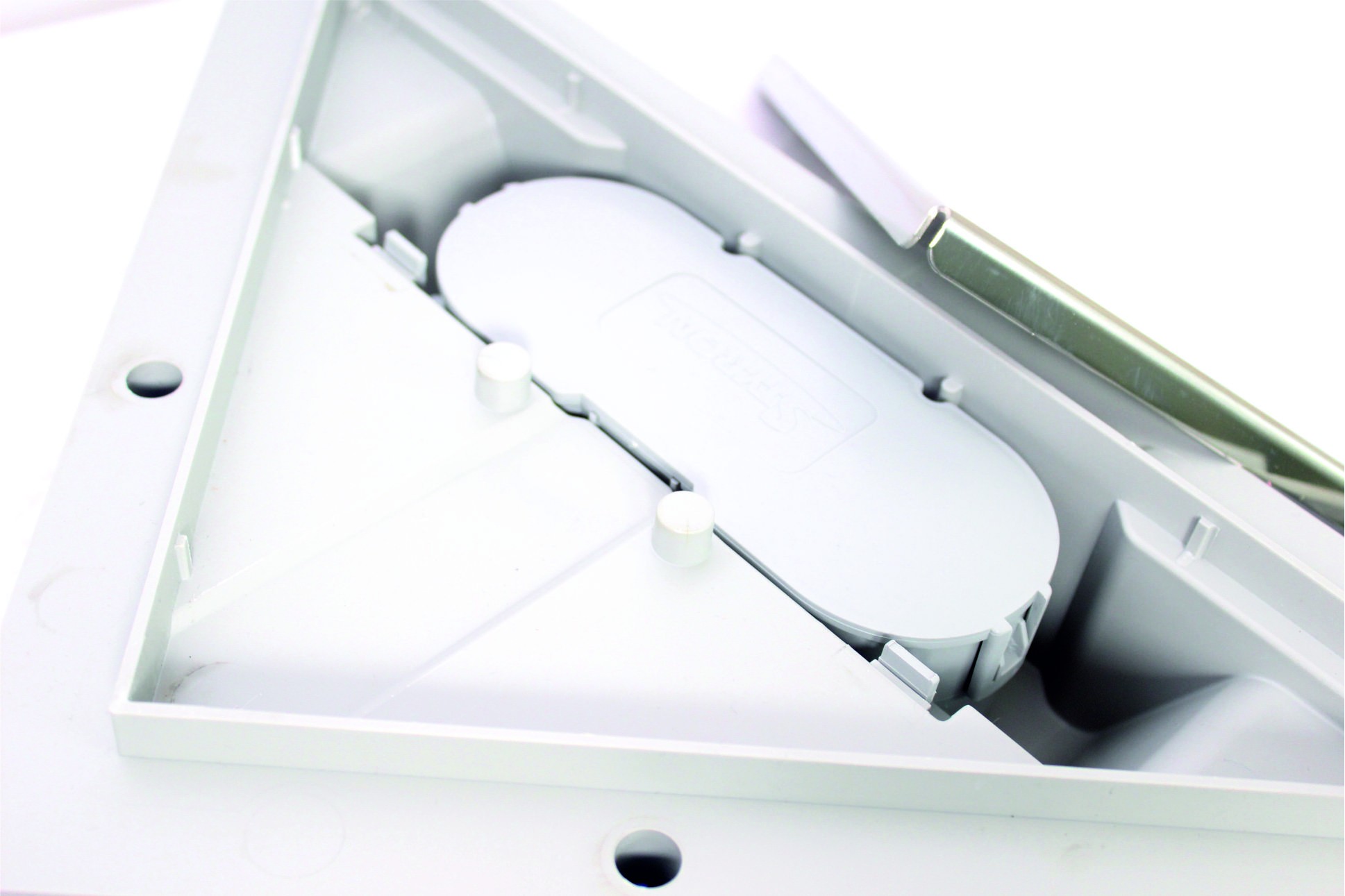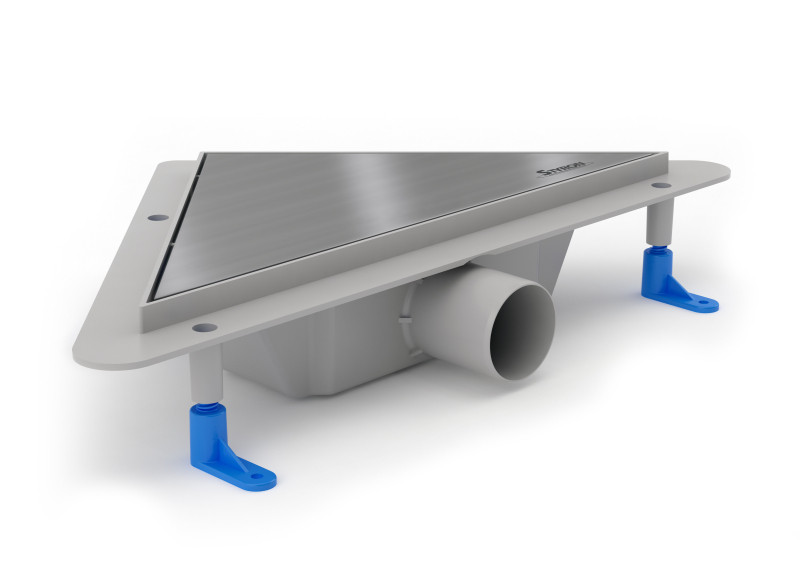 Tento moderní odtokový rohový žlab nabízí velmi kvalitní zpracování a kombinaci pevného plastu s leštěným nerezovým roštem.