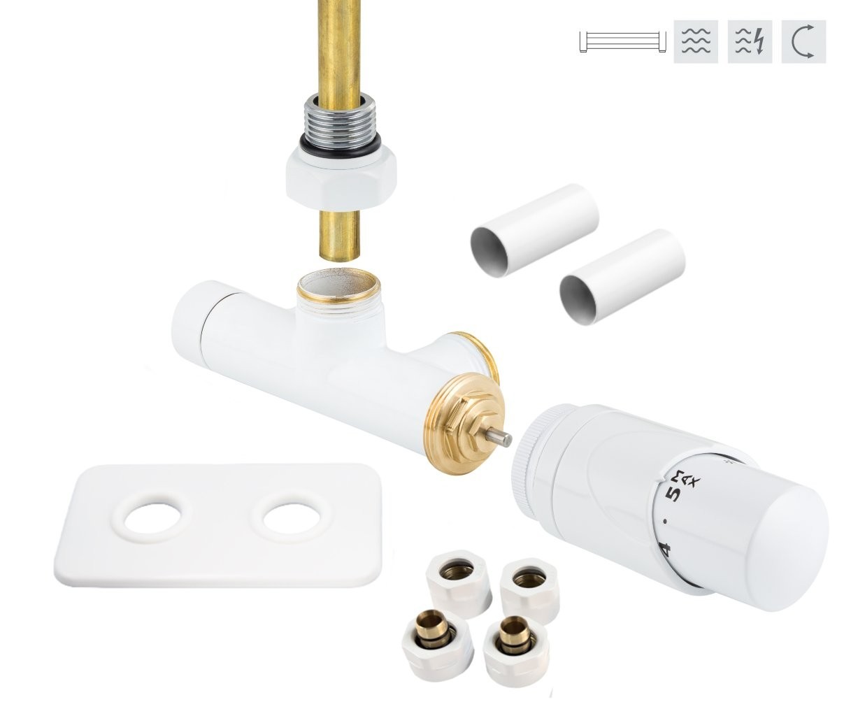 2 870,00 CZKONE-SADA, 1-bodový ventil s hlavicí+svěrné šroub.Cu+Al-Pex, mosaz.rozeta+krycí trubičky,bílá barva