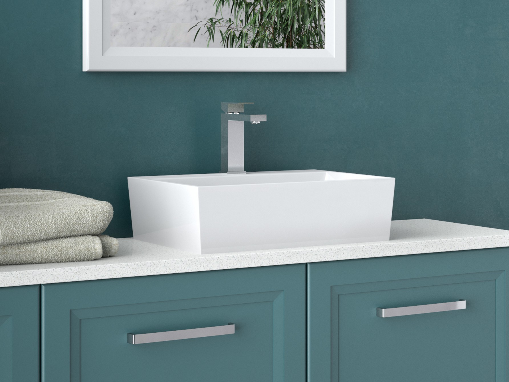 Umyvadlo VERA na desku nemá standardně otvor pro stojánkovou baterii (na přání lze objednat s otvorem na baterii bez příplatku), pro elegantní řešení můžete použít umyvadlové podomítkové baterie, nebo umyvadlové vysoké stojánkové baterie.