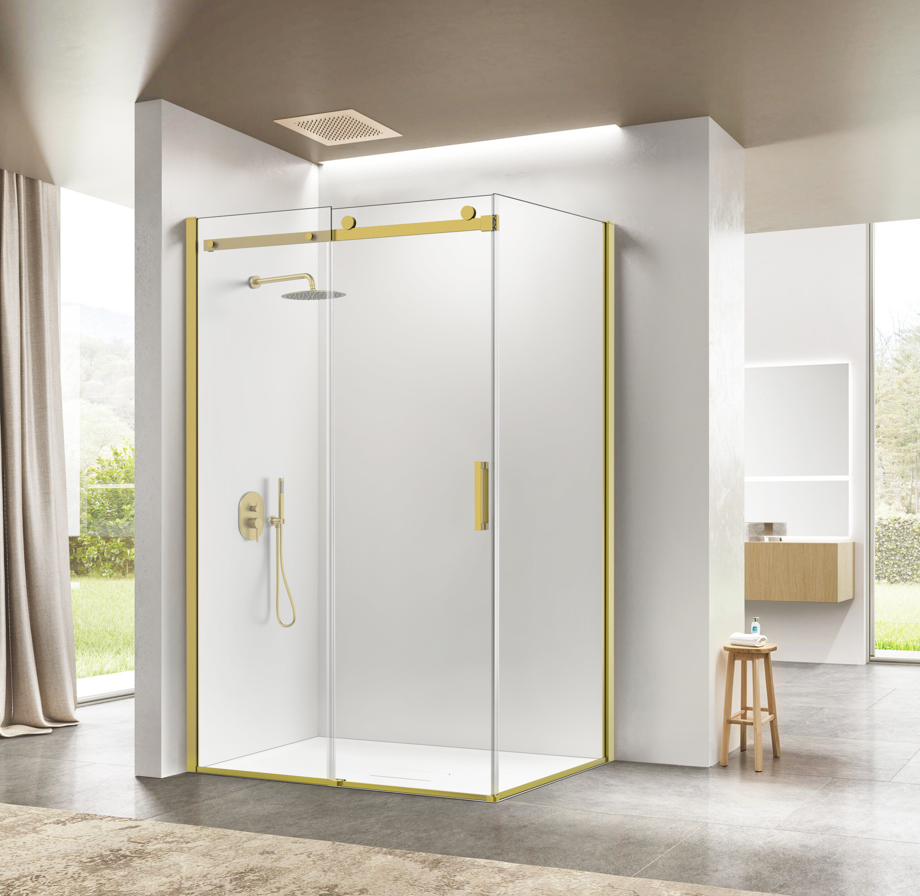 Dveře lze kombinovat s pevnou stěnou PANEL BELVER GOLD a vytvořit tak praktický obdélníkový sprchový kout.