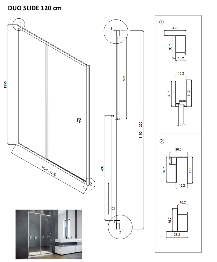 - Montážní rozměr pro šířku 120 cm: 118 - 122 × 195 cm, šířka vstupu: 46,5 cm