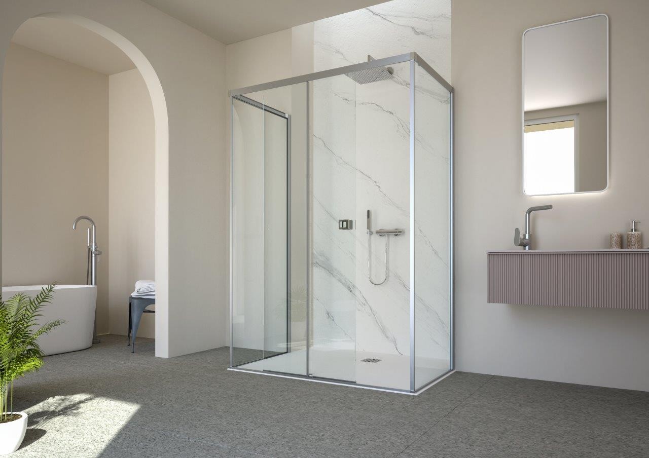 Posuvné skleněné stěny řeší atypické vstupy v prostorných koupelnách. Vytváří velmi luxusní dojem, který je podpořen výrazným madlem. Dveře se dodávají v levém nebo pravém provedení. Bezpečnostní sklo je opatřeno povrchovou úpravou AQUA CLEAN pro jednodušší údržbu.