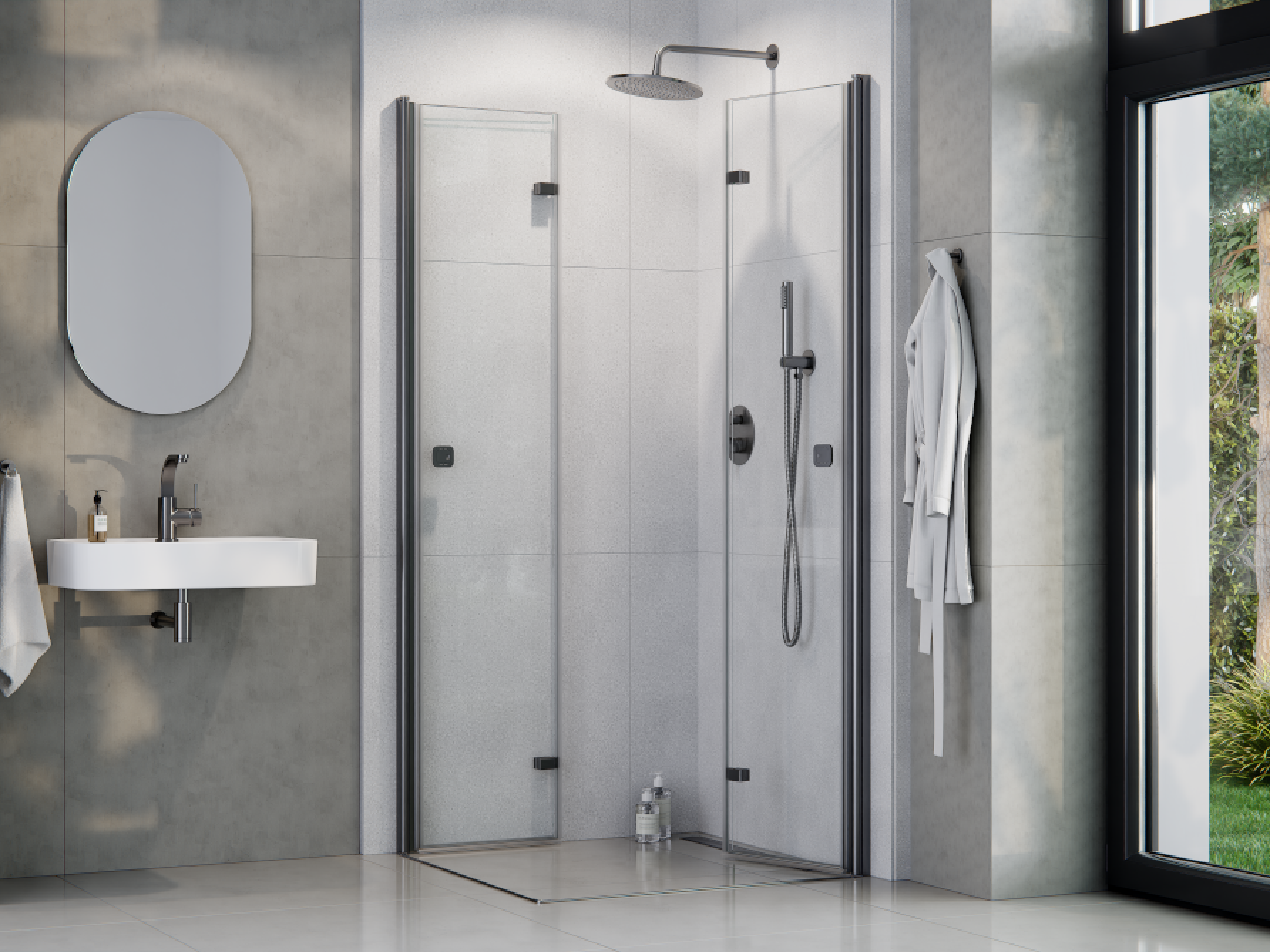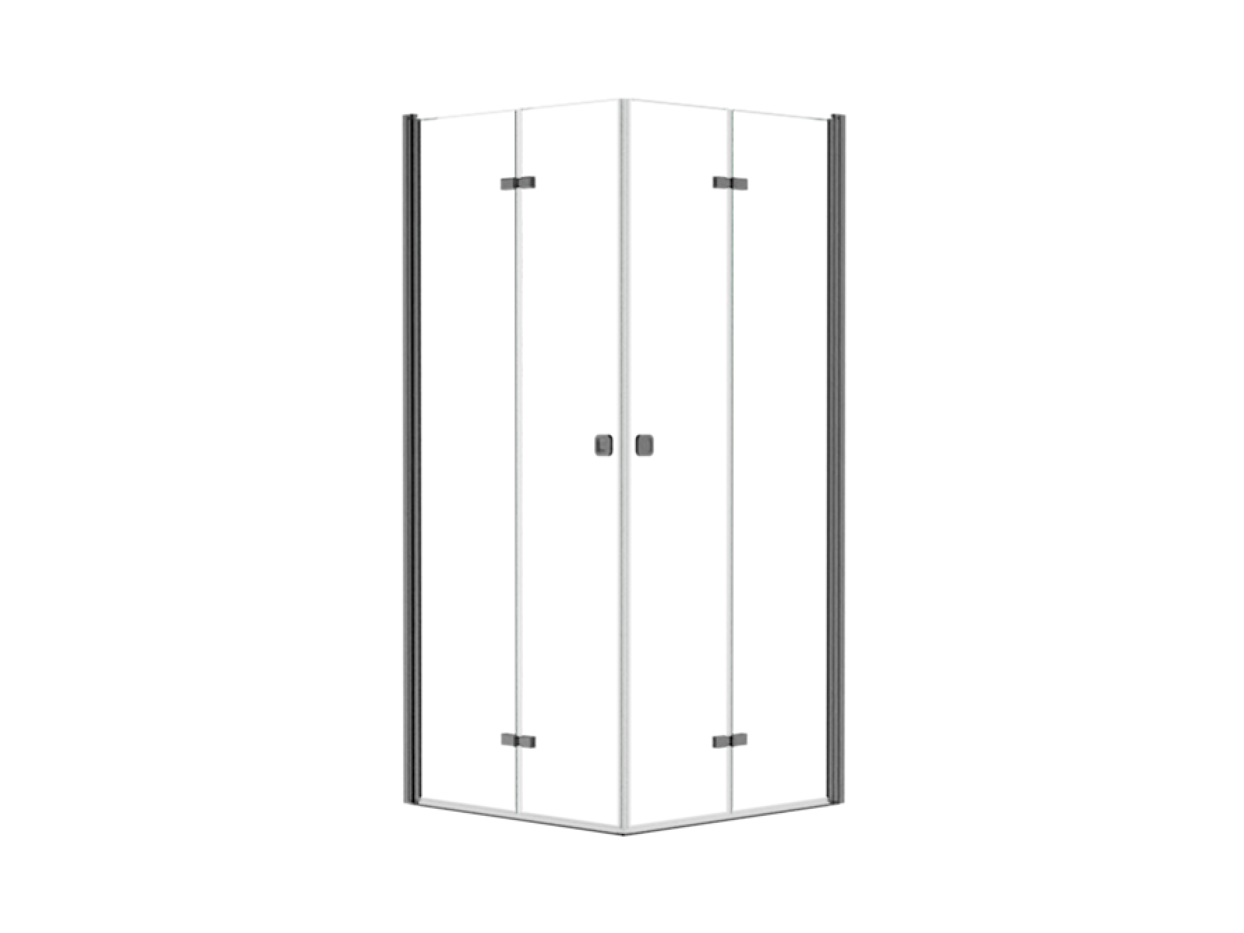 Čtvercový celoskleněný sprchový kout EXO-H GRAFIT vyniká vysoce kvalitním zpracováním a spolehlivou funkčností všech součástí a materiálů. Kout se skládá ze dvou protilehlých zalamovacích dveří, které se otevírají do prostoru. Spodní hrana dveřní skla je opatřena okapničkou, díky níž voda ze skla při otevření nezteče do prostoru koupelny, ale do vnitřního prostoru koutu.