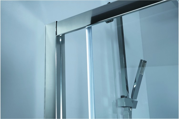 Velmi praktické posuvné skleněné stěny řeší atypické vstupy v prostorných koupelnách. Díky absenci spodního vodícího profilu vzniká ideální bezbariérový vstup do sprchy. Lze dodatečně dokoupit i další designová madla.
