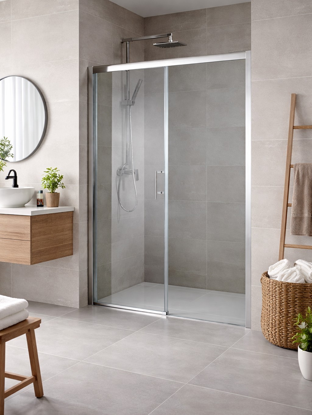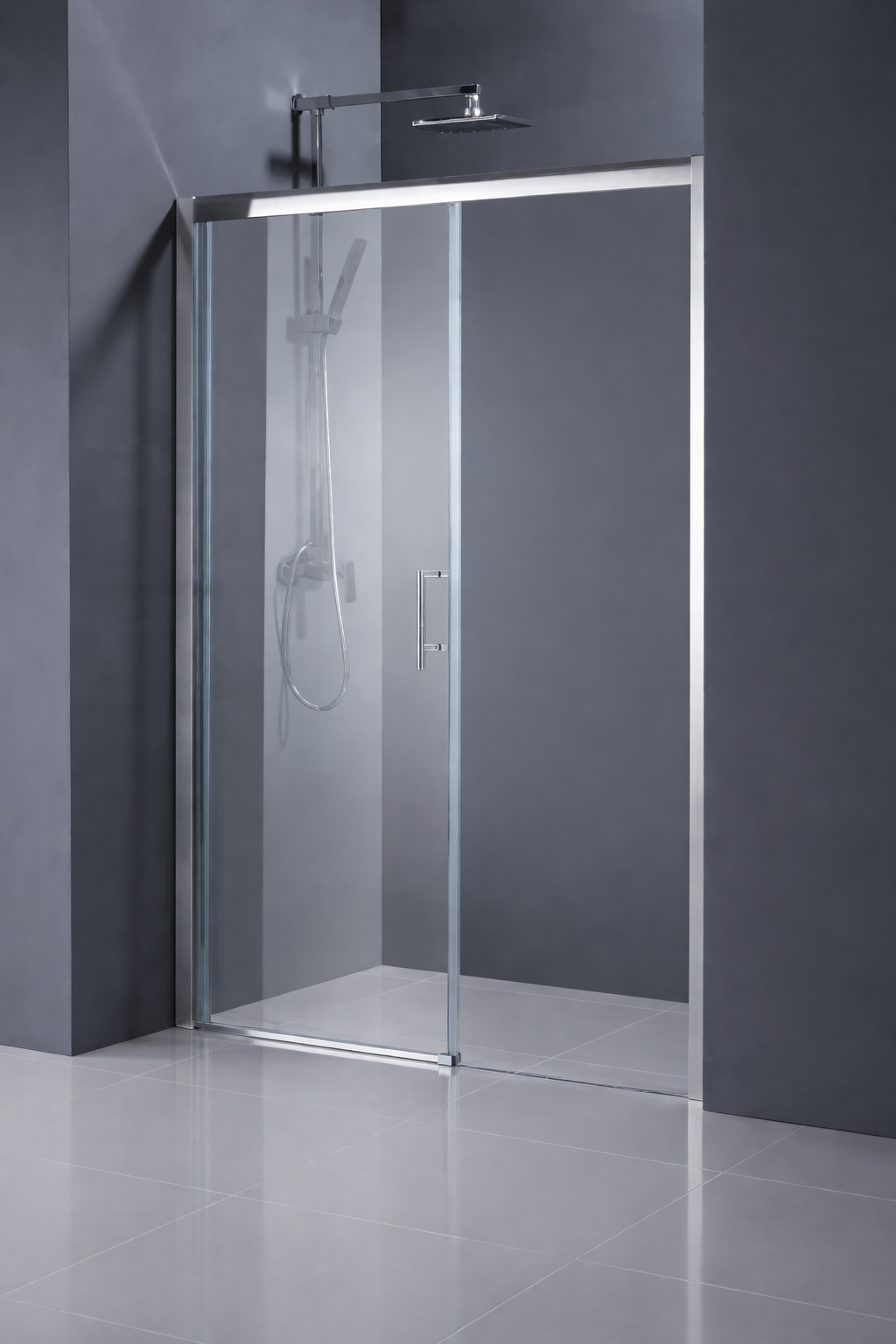 Velmi praktické posuvné skleněné stěny řeší atypické vstupy v prostorných koupelnách. Díky absenci spodního vodícího profilu vzniká ideální bezbariérový vstup do sprchy. Lze dodatečně dokoupit i další designová madla.