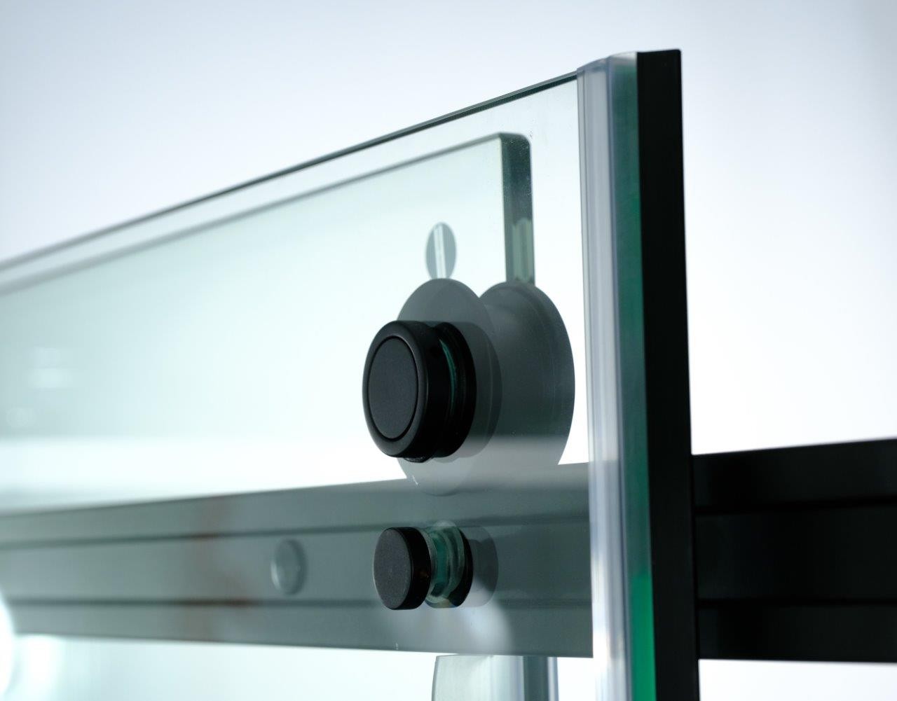 Luxusní skleněné posuvné dveře do niky v kvalitní černé barvě hliníkových profilů. Plynulý a komfortní pohyb dveří zajišťují horní masivní bezúdržbová ložisková kola a spodní vodící díl. Díky absenci spodního vodícího profilu, vzniká ideální bezbariérový vstup do sprchy. Tyto dveře jsou vyrobeny ze skel o síle 8 mm. Dodává se v univerzálním pravém i levém provedení.