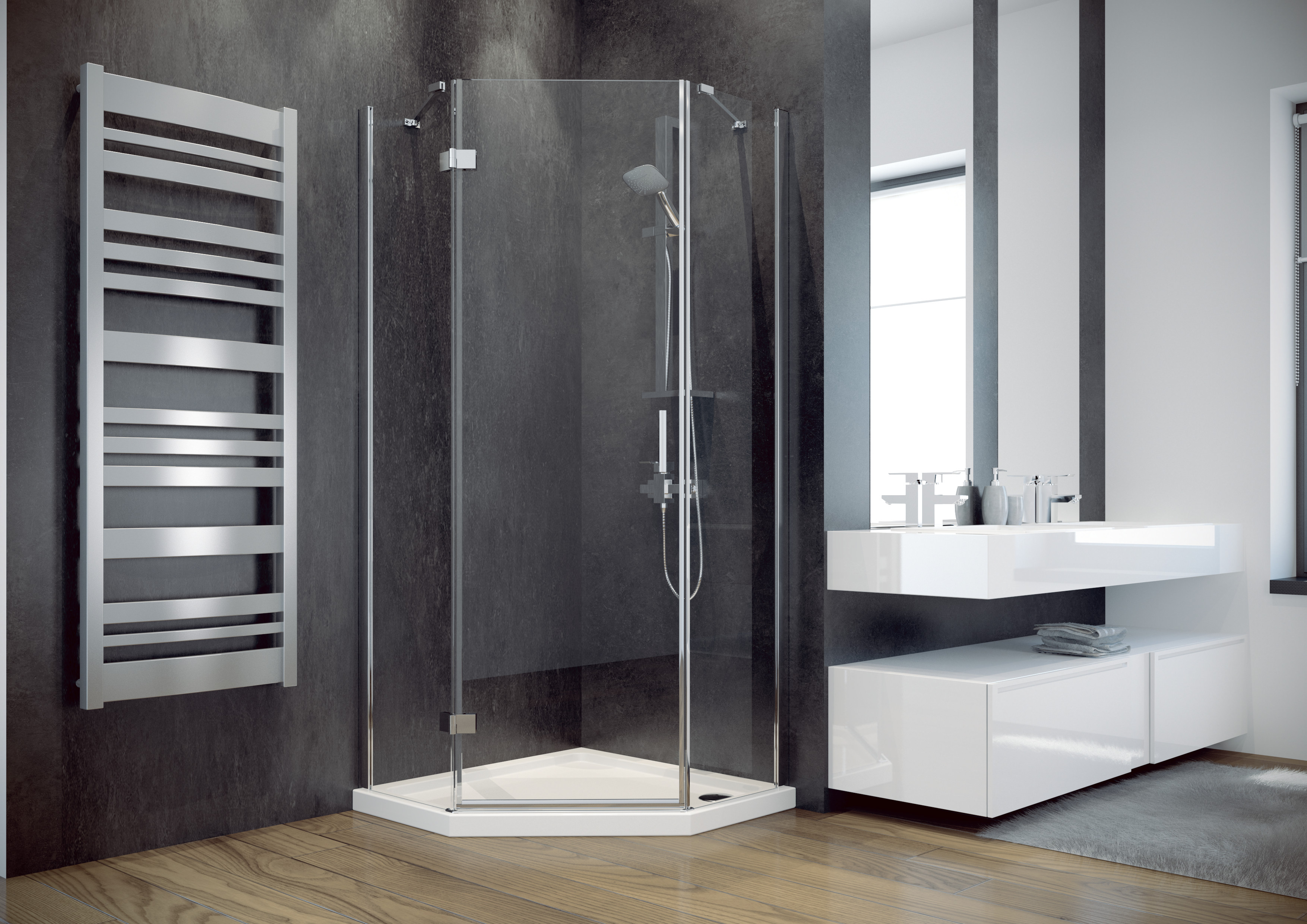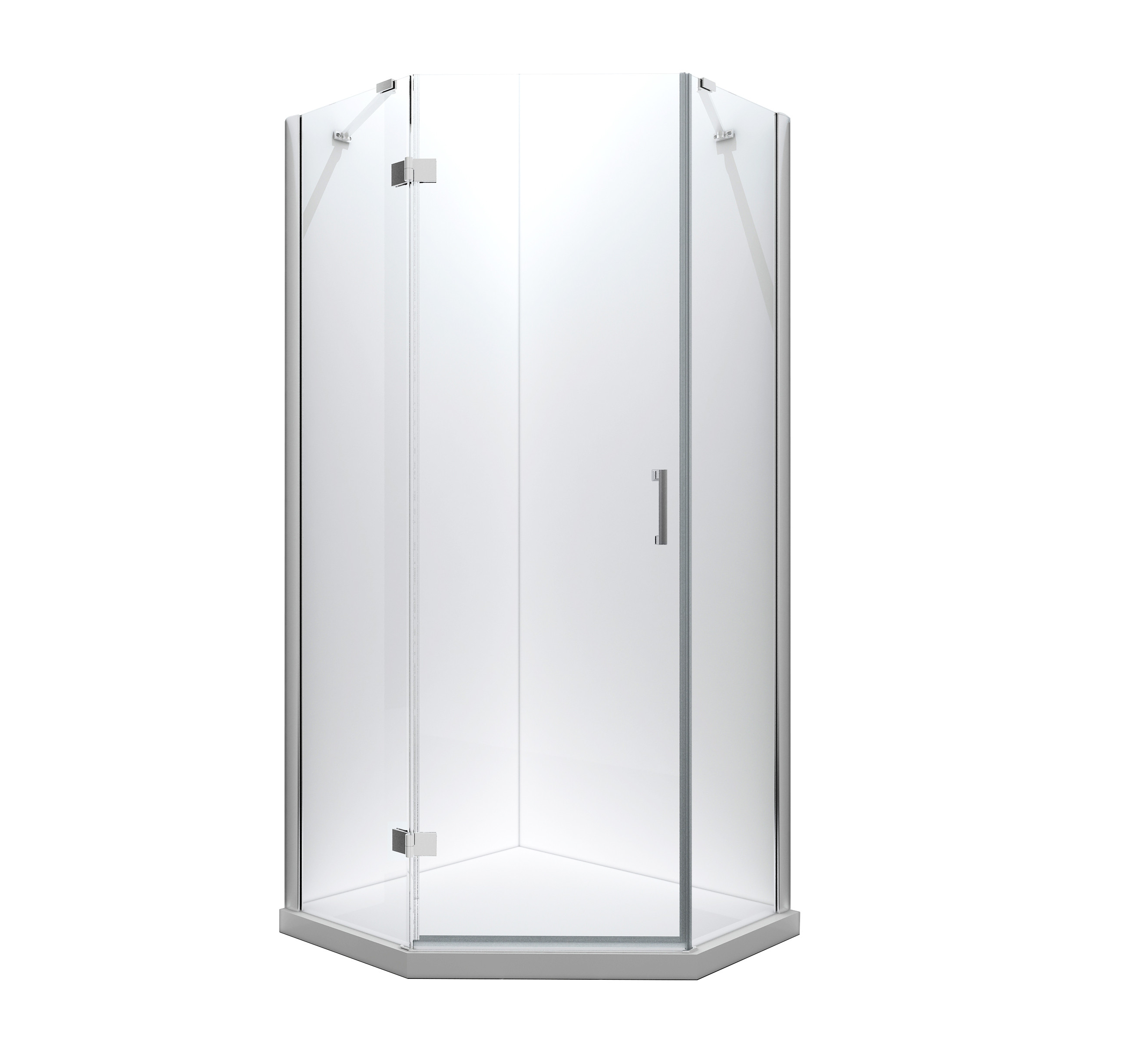 Pětiúhelníkový celoskleněný sprchový kout VIVA 195P vyniká vysoce kvalitním zpracováním a spolehlivou funkčností všech součástí a materiálů. Zástěna se skládá ze dvou pevných skel a dveří, které jsou osazeny elegantním madlem a minimalistické panty, ktreré jsou dokonale sladěny a poskytují zástěně jedinečný vzhled. Spodní hrana dveřní skla je opatřena okapničkou, díky níž voda ze skla při otevření nezteče do prostoru koupelny, ale do vnitřního prostoru koutu.