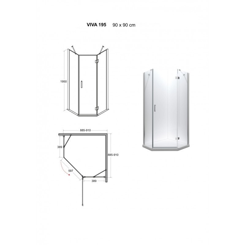 Pětiúhelníkový celoskleněný sprchový kout VIVA 195P vyniká vysoce kvalitním zpracováním a spolehlivou funkčností všech součástí a materiálů. Zástěna se skládá ze dvou pevných skel a dveří, které jsou osazeny elegantním madlem a minimalistické panty, ktreré jsou dokonale sladěny a poskytují zástěně jedinečný vzhled. Spodní hrana dveřní skla je opatřena okapničkou, díky níž voda ze skla při otevření nezteče do prostoru koupelny, ale do vnitřního prostoru koutu.