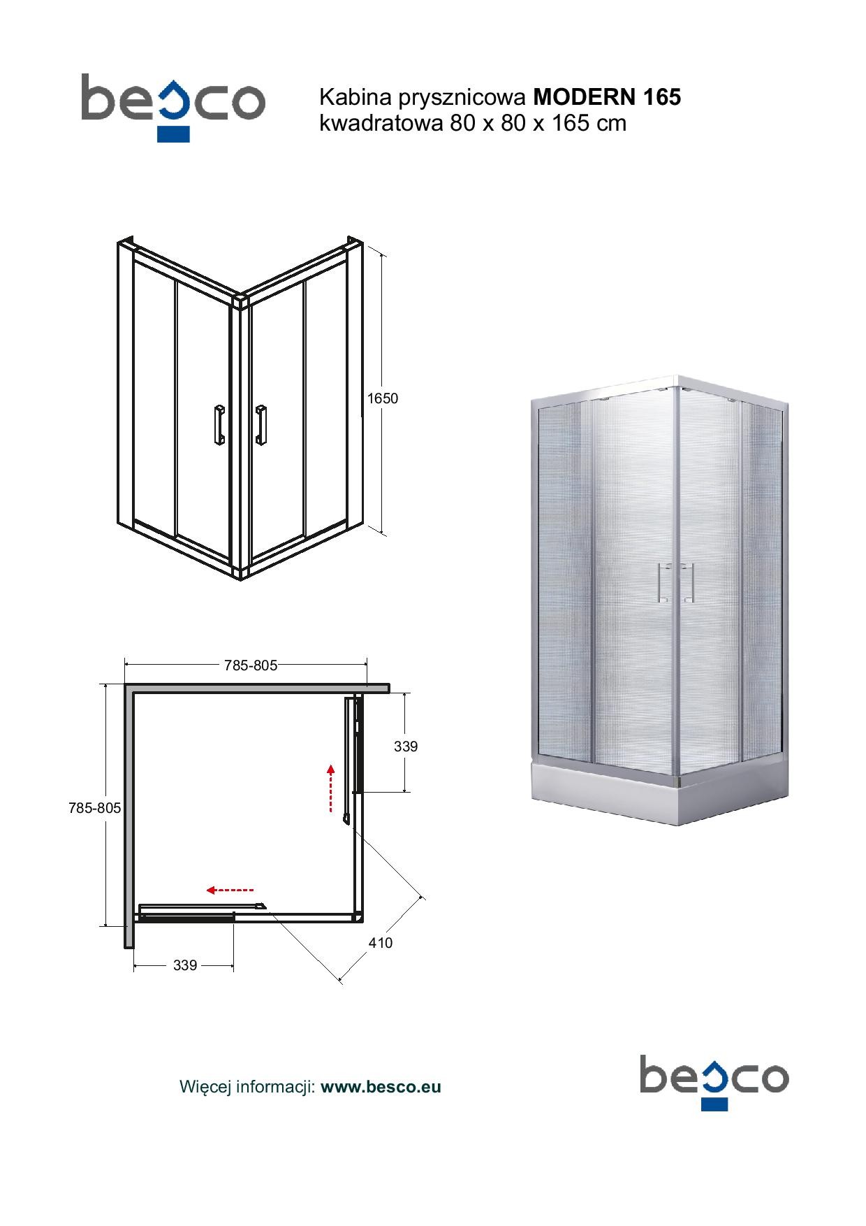 Čtvercový sprchový kout MODERN 165 vyniká vysoce kvalitním zpracováním a spolehlivou funkčností všech součástí a materiálů. Zástěna s výškou 165 cm je určena pro vaničky IGOR, ARES a VRACA.