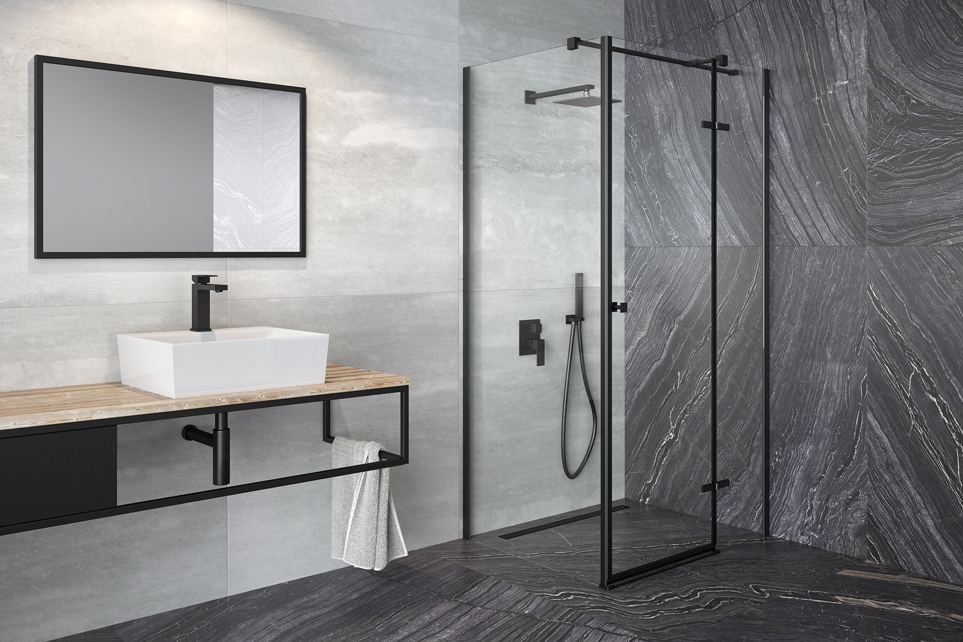 Čtvercový celoskleněný sprchový kout PIXA BLACK vyniká vysoce kvalitním zpracováním a spolehlivou funkčností všech součástí a materiálů. Kout se skládá z pevných skel a zalamovacích dveří, které se otevírají do prostoru. Spodní hrana dveřní skla je opatřena okapničkou, díky níž voda ze skla při otevření nezteče do prostoru koupelny, ale do vnitřního prostoru koutu.