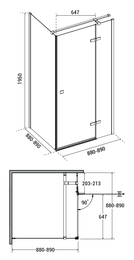- 90 × 90 × 195 cm (montážní rozměr 88 - 89 cm)