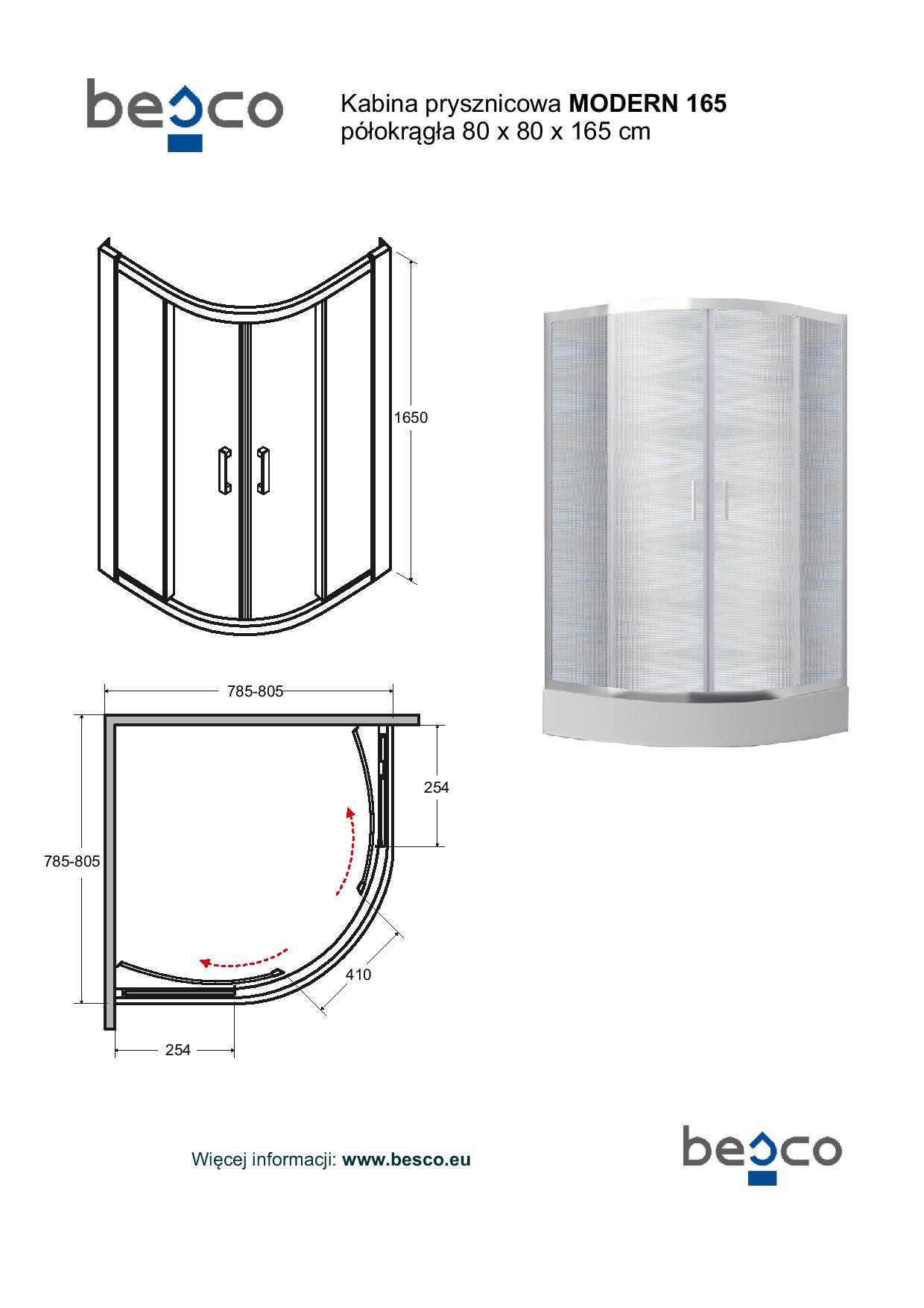 Čtvrtkruhový sprchový kout MODERN 165 (bez vaničky) vyniká vysoce kvalitním zpracováním a spolehlivou funkčností všech součástí a materiálů. Zástěna s výškou 165 cm je určena pro vaničky DIPER I a DIPER II.