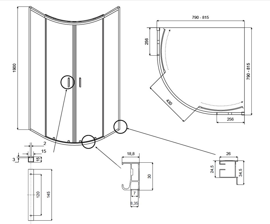 - Rozměr ZARYA: 80 x 80 x 190 cm / 90 x 90 x 190 cm, R 550, šířka vstupu 43 / 54 cm