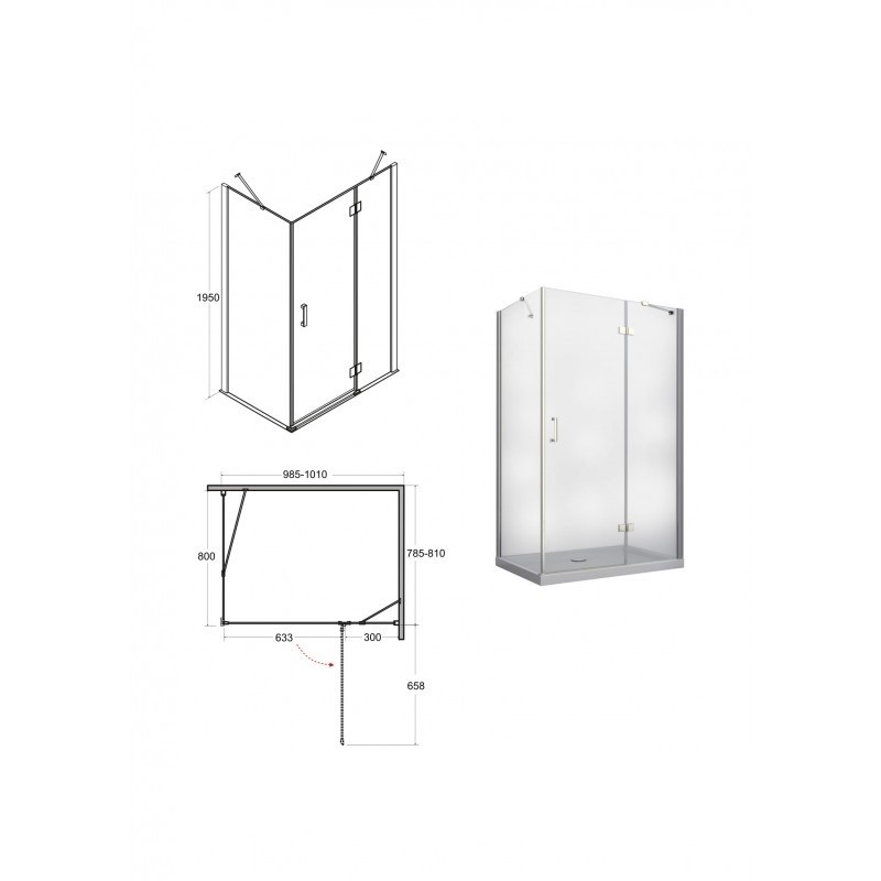 otevírají do prostoru. Spodní hrana dveřní skla je opatřena okapničkou, díky níž voda ze skla při otevření nezteče do prostoru koupelny, ale do vnitřního prostoru koutu. Kout je možné objednat ve třech rozměrech 100 × 80 × 195 cm , 120 × 80 × 195 cm nebo 120 × 90 × 195 cm.