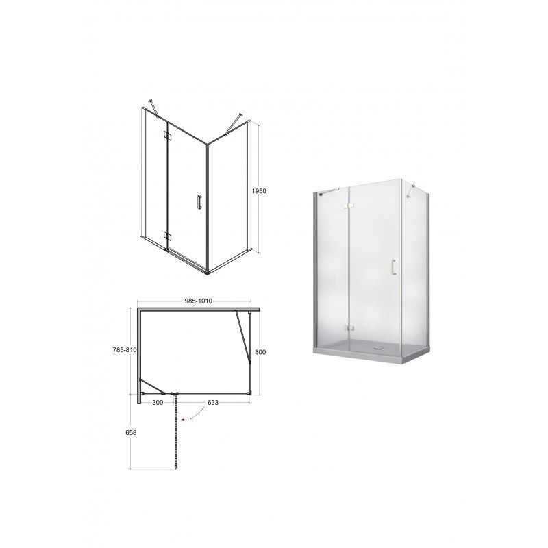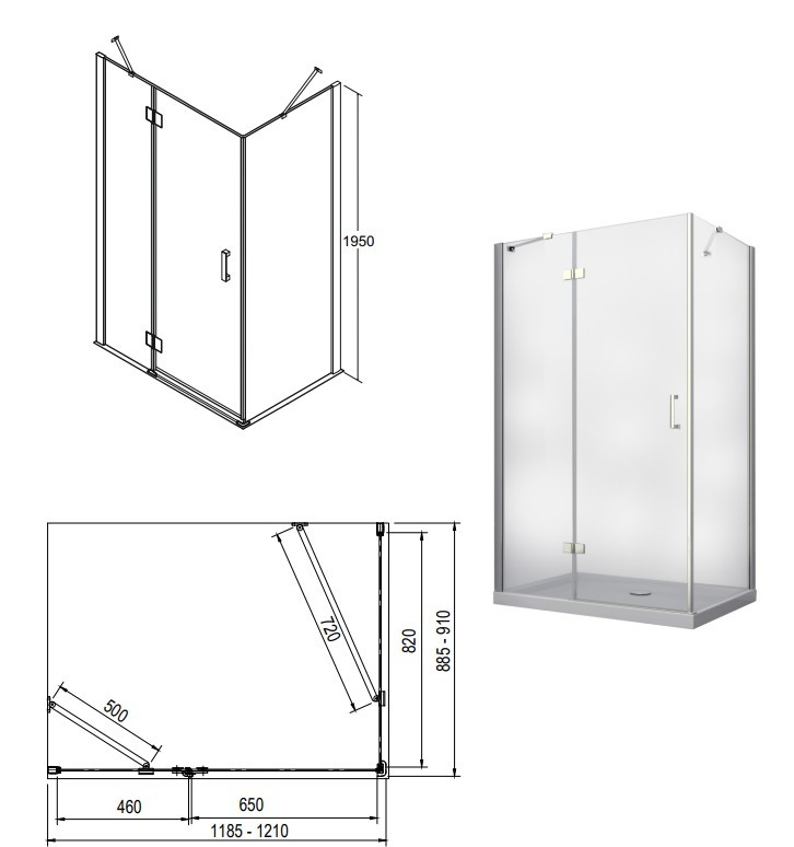 otevírají do prostoru. Spodní hrana dveřní skla je opatřena okapničkou, díky níž voda ze skla při otevření nezteče do prostoru koupelny, ale do vnitřního prostoru koutu. Kout je možné objednat ve třech rozměrech 100 × 80 × 195 cm , 120 × 80 × 195 cm nebo 120 × 90 × 195 cm.