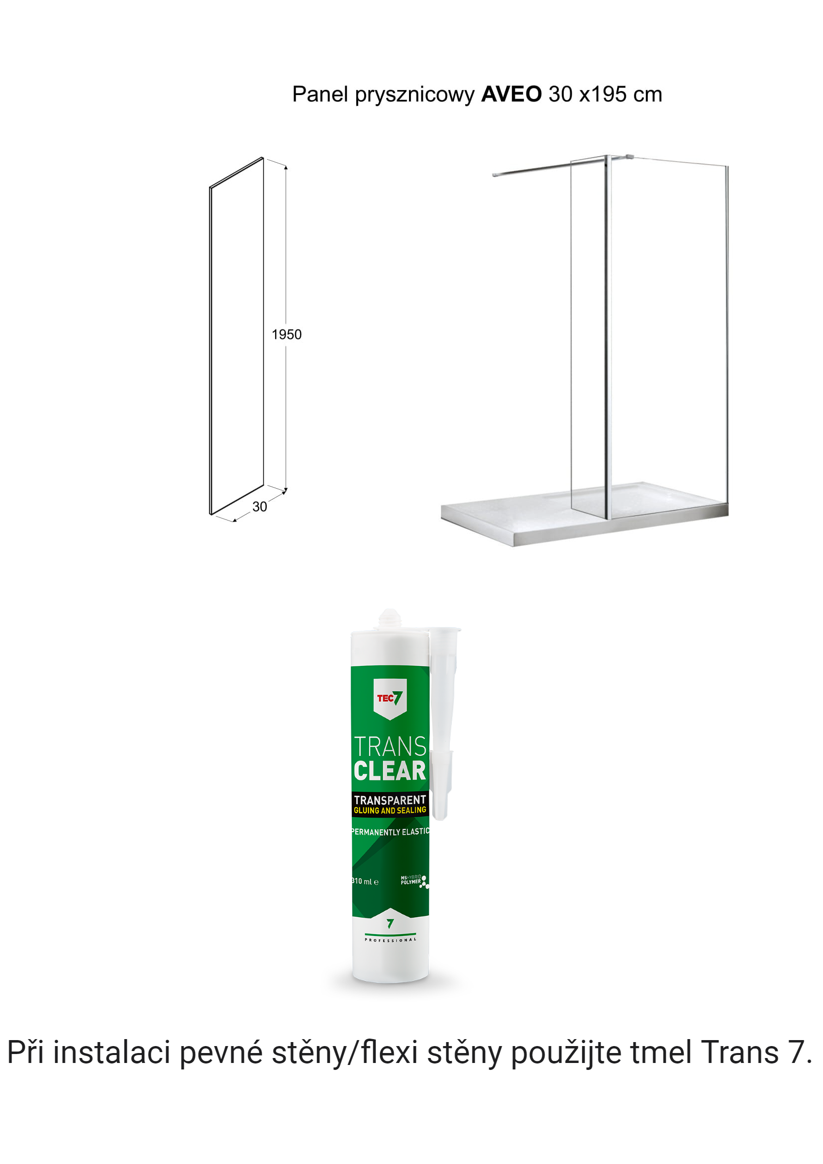 Při instalaci pevné stěny/flexi stěny použijte tmel Trans 7.