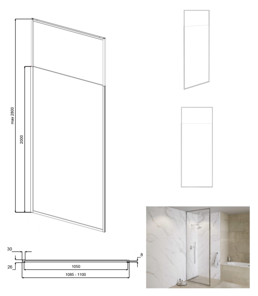 Rám pevné stěny má nastavitelnou výšku 200 až 280 cm. Bez nutnosti montáže rozpěrné tyče. Díky teleskopickému výsuvu horní hrany, je možné přichytit zástěnu do stropu.