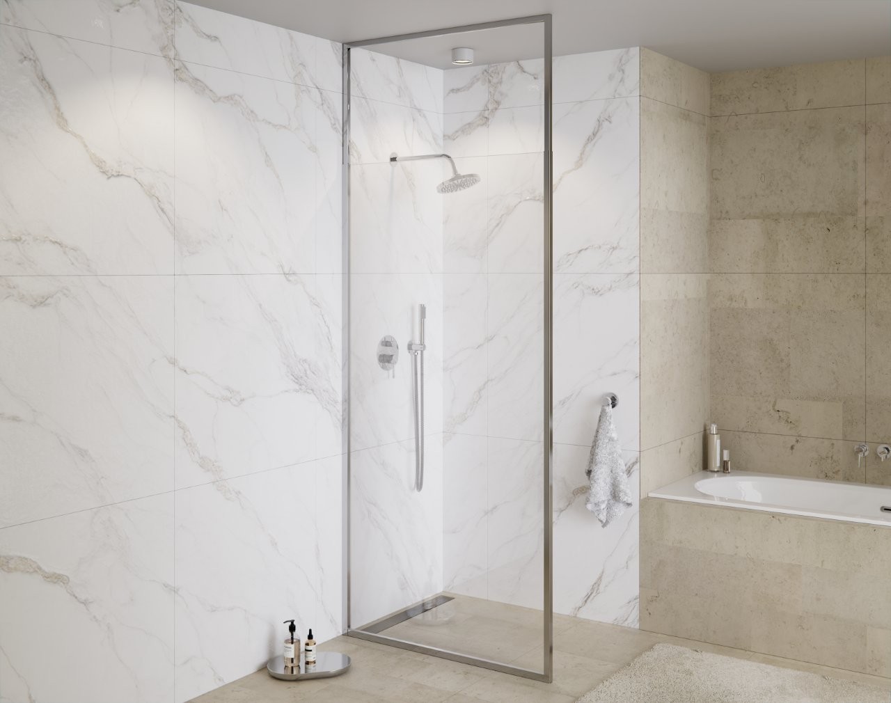 Walk-in sprchový kout ICON CHROM nabízí revoluční řešení bez použití pohyblivých dveří, rohových vzpěr a pantů. Ve spojení s moderními odtokovými kanálky vznikne zcela bezbariérový prostor pro sprchování. Zástěny jsou vyrobeny z bezpečnostního skla.