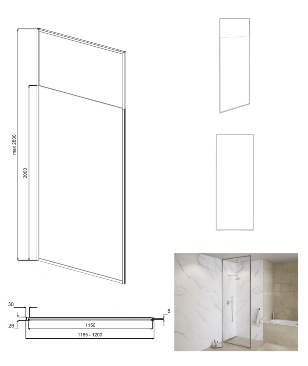 Rám pevné stěny má nastavitelnou výšku 200 až 280 cm. Bez nutnosti montáže rozpěrné tyče. Díky teleskopickému výsuvu horní hrany, je možné přichytit zástěnu do stropu.