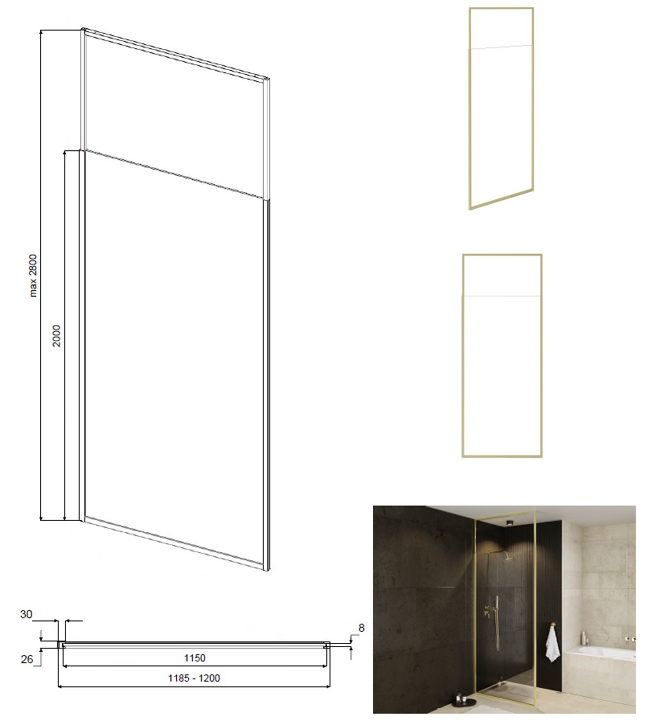 Rám pevné stěny má nastavitelnou výšku 200 až 280 cm. Bez nutnosti montáže rozpěrné tyče. Díky teleskopickému výsuvu horní hrany, je možné přichytit zástěnu do stropu.