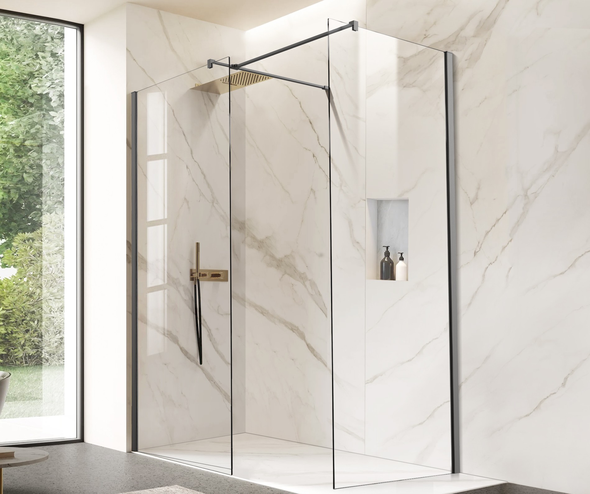 Walk-in sprchová zástěna LAGOS NEW s rámem a rozpěrnou tyčí ve čtyřech barvách (chrom, černá, zlatá a grafitová), nabízí jednoduché a přitom praktické řešení bez použití pohyblivých dveří, ale s maximálním vstupem. Dá se osadit jak na sprchové vaničky, tak i přímo na podlahu.