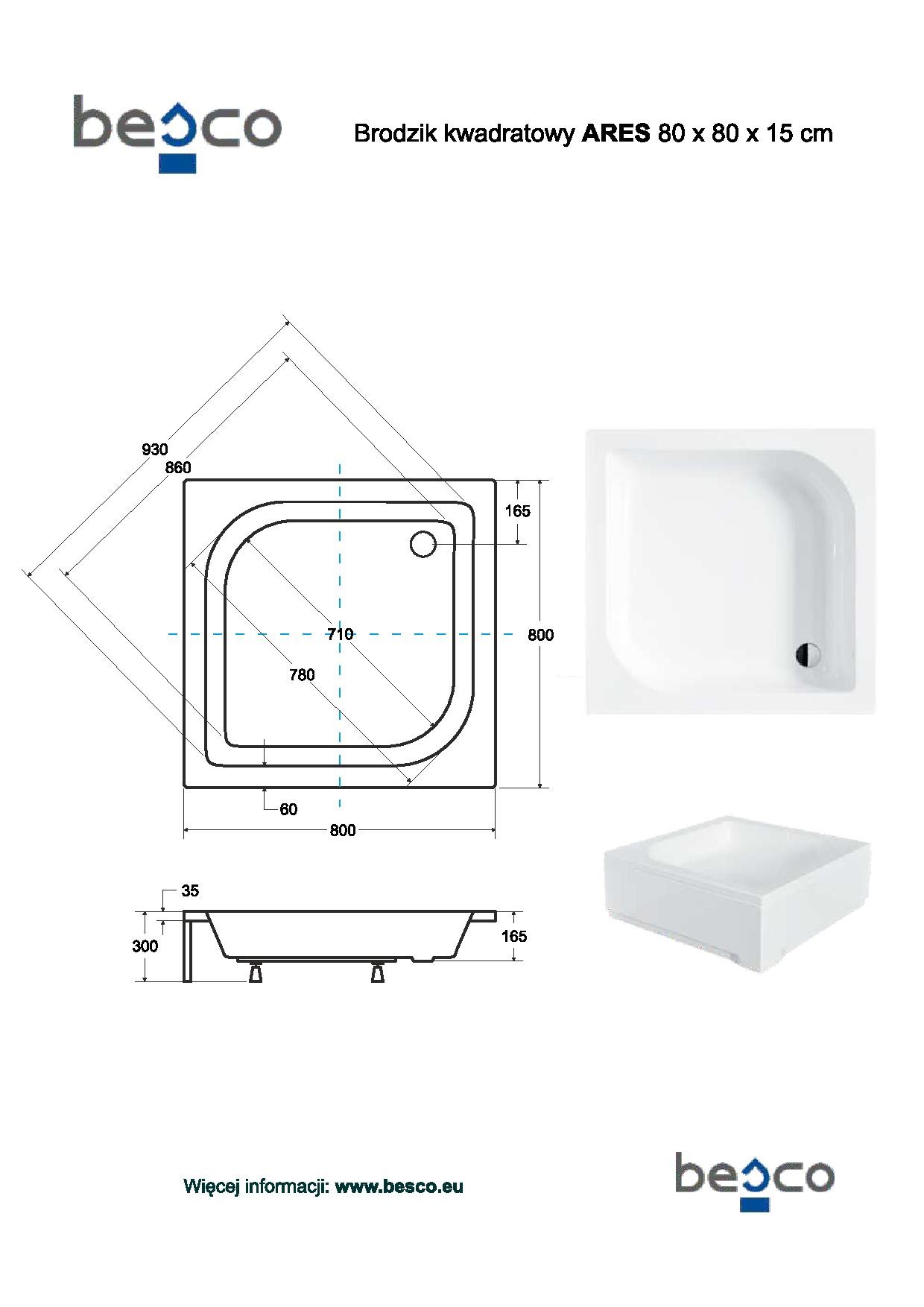 2 989,99 CZKARES - hluboká čtvercová sprchová vanička akrylátová 80x80x16,5cm, včetně nožiček