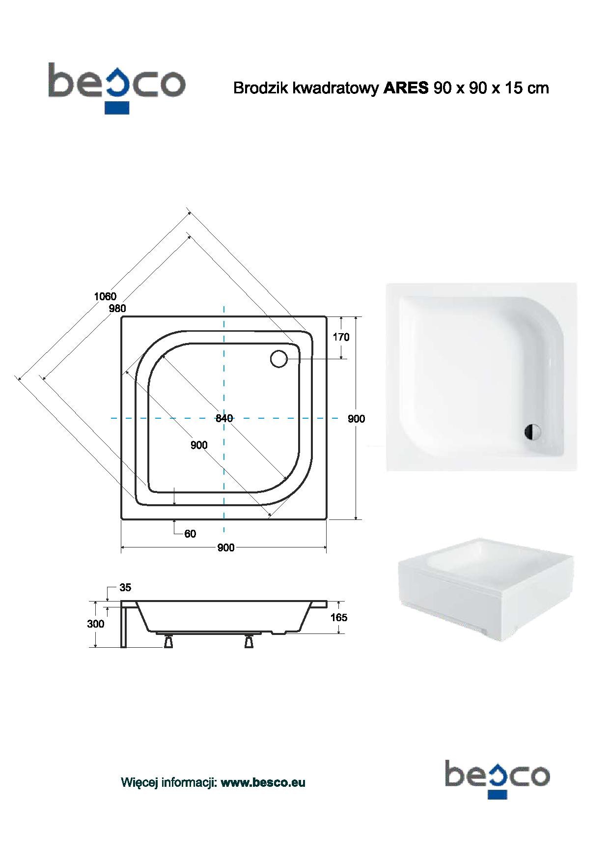 ARES - hluboká čtvercová sprchová vanička akrylátová 90x90x16,5cm, včetně nožiček