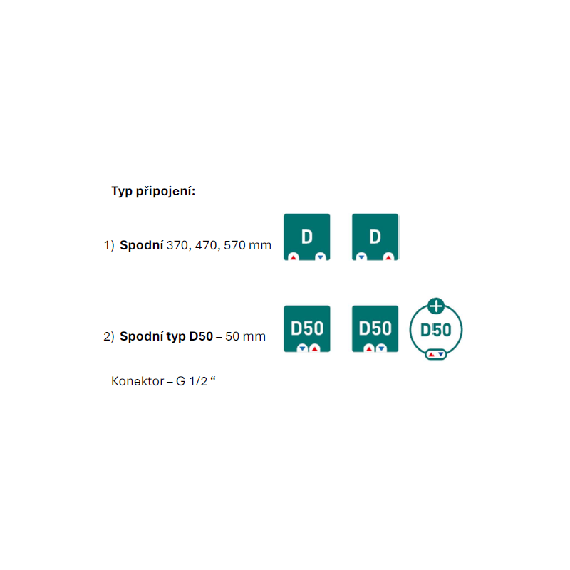 Lze dodat spodní centrální připojení 50 mm za příplatek 10% k ceně za spodní připojení. V případě zájmu o tento druh připojení, přidejte do poznámky (Připojení spodní 50 mm). Upozorňujeme, že tento druh připojení je pouze na objednávku.