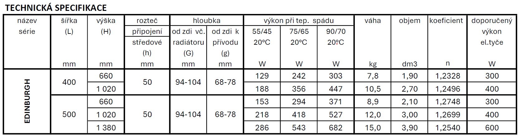 Dostupné rozměry a typy připojení radiátoru EDINBURGH: