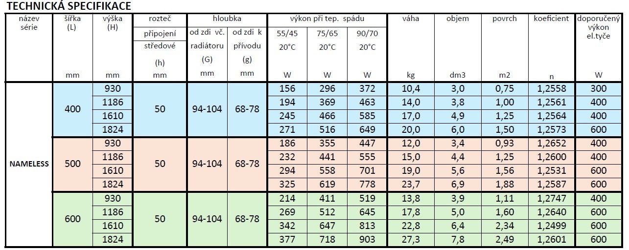 Radiátory jsou dodávány BEZ topné tyče, za rozměrem je pouze uveden vhodný výkon tyče pro patřičný rozměr. Standardní barva C35 white silk (bílá lesklá).