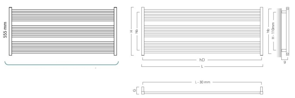 - 1000 × 555 mm, výkon 554 W, topná tyč 600 W - připojení klasické (na rozteč) / středové 50 mm