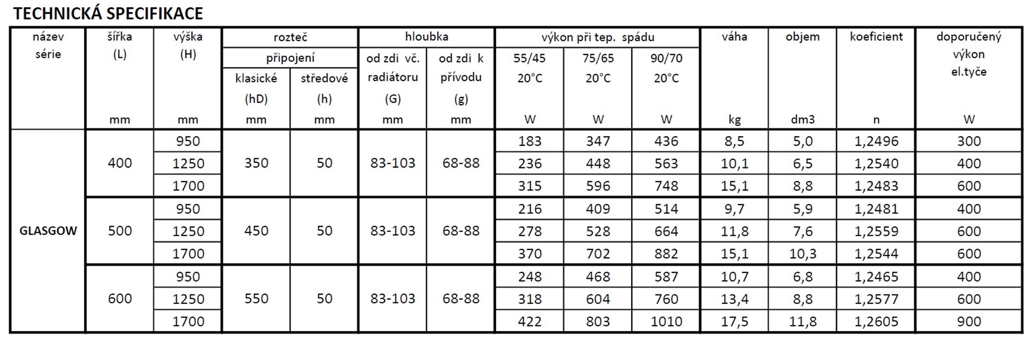 Dostupné rozměry a typy připojení radiátoru GLASGOW: