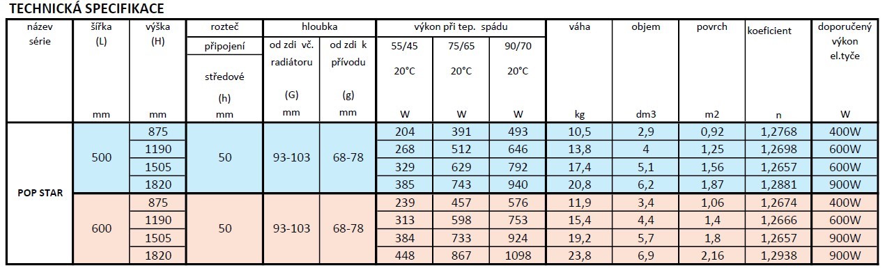 - 500 × 1505 mm, výkon 629 W, topná tyč 600 W
