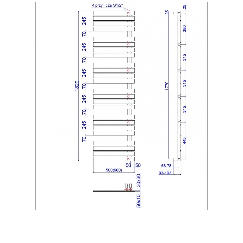 - 500 × 1690 mm, výkon 696 W, topná tyč 600 W